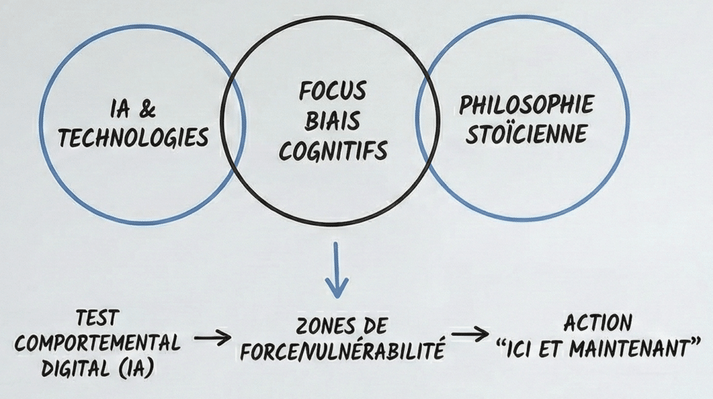 Un accompagnement de type Executive Coaching, sur un cycle de 7 à 10 séances  d’1h30 environ, auprès d’un dirigeant dans le secteur bancaire. La mission a démarré par un TEST COMPORTEMENTAL DIGITAL INNOVANT pour évaluer, grâce à une première  analyse par  l’IA, les forces et vulnérabilités aux biais cognitifs. Appuyé par la philosophie stoïcienne, un plan d’actions claires, simples et immédiates a pu être défini et mise en oeuvre par le coaché.