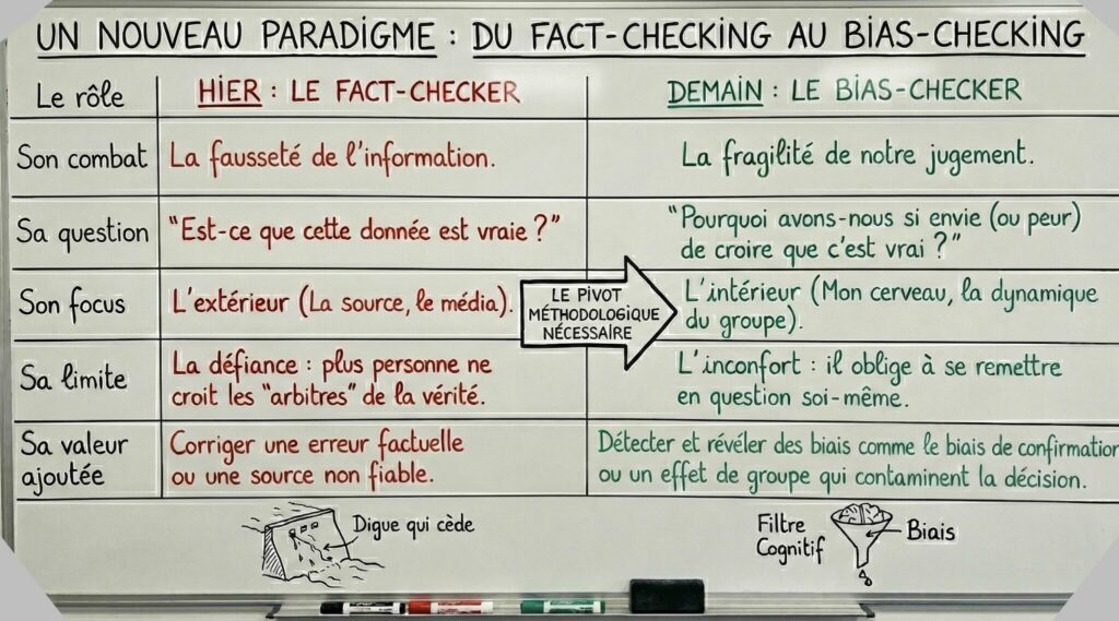 Comme je le résume dans le tableau ci-dessus, il est temps d’opérer un pivot méthodologique important dans nos démarches collaboratives et gouvernances associées : passer du rôle de « Fact-Checker » à celui de « Bias-Checker ».