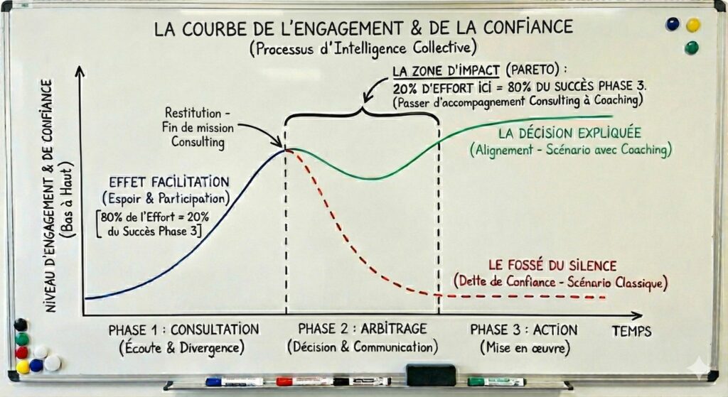 🔴 La courbe rouge (Le Scénario Classique) : faute d’arbitrage clair et de décision expliquée dans le bon timing (ce qui sera mis en oeuvre et pourquoi, ce qui n’a pas été retenu et pourquoi, ce qui continuera d’être analysé parce qu’innovant), on tombe dans le « Fossé du Silence ». L’attente se transforme en frustration. L’engagement accumulé s’effondre avant même le passage à l’action. On a créé une déception et une dette de confiance pour la suite.